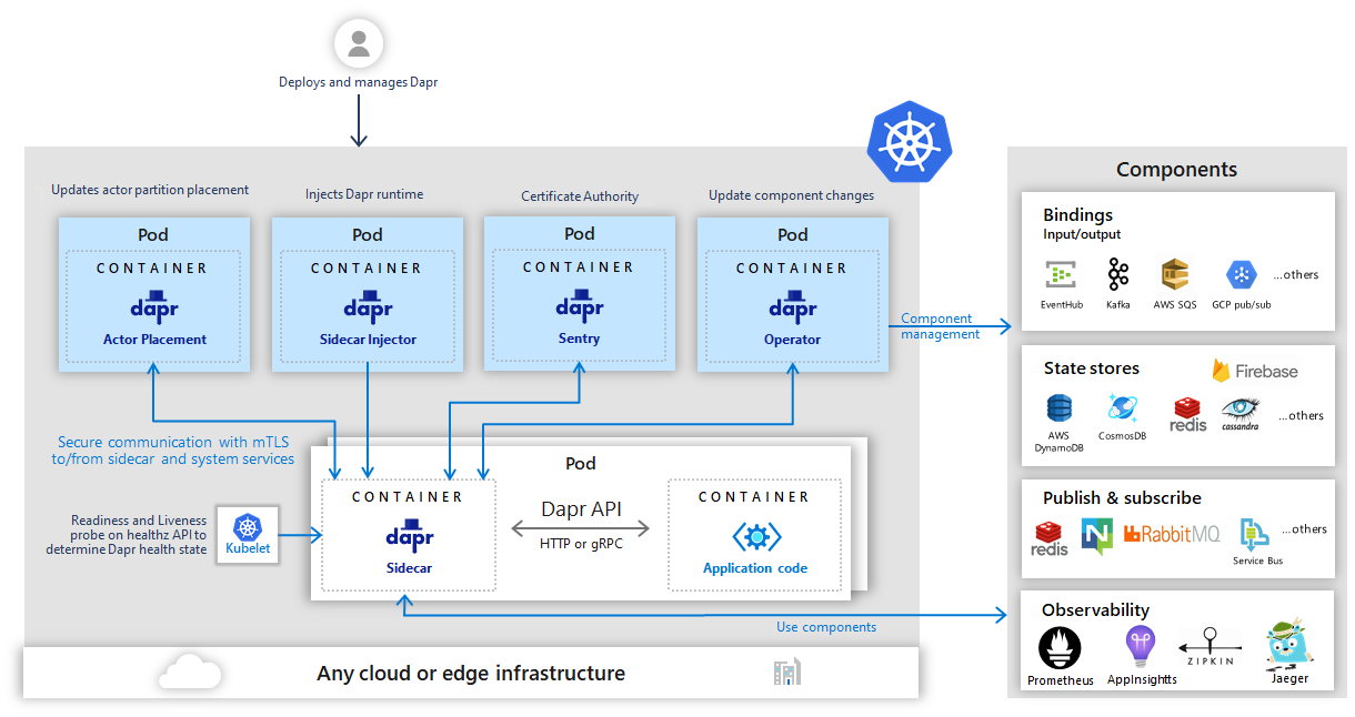 Dapr can be configured to run on any Kubernetes cluster. In Kubernetes the dapr-sidecar-injector and dapr-operator services provide first class integration to launch Dapr as a sidecar container in the same pod as the service container and provide notifications of Dapr component updates provisioned into the cluster.