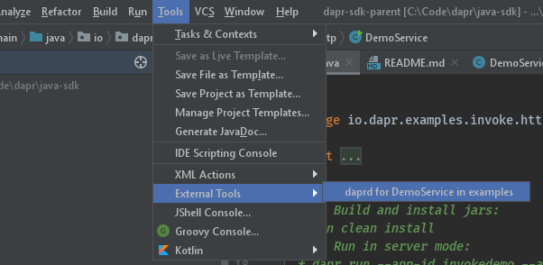 <tool name="daprd for DemoService in examples" description="Dapr sidecar" showInMainMenu="false" showInEditor="false" showInProject="false" showInSearchPopup="false" disabled="false" useConsole="true" showConsoleOnStdOut="true" showConsoleOnStdErr="true" synchronizeAfterRun="true">