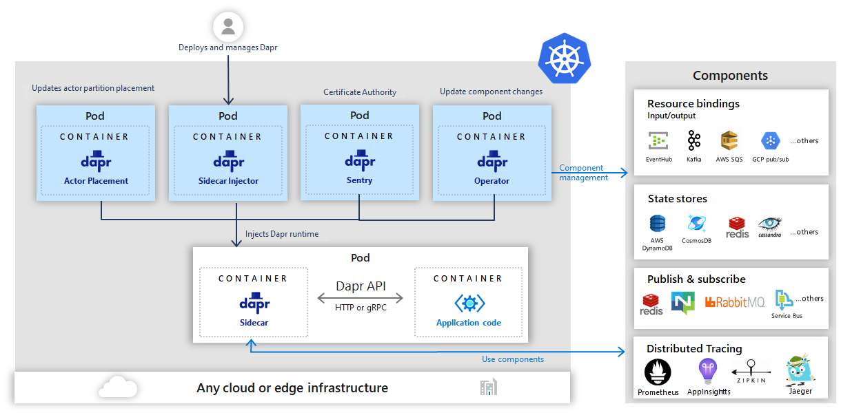 Dapr can be configured to run on any Kubernetes cluster. In Kubernetes the dapr-sidecar-injector and dapr-operator services provide first class integration to launch Dapr as a sidecar container in the same pod as the service container and provide notifications of Dapr component updates provisioned into the cluster.