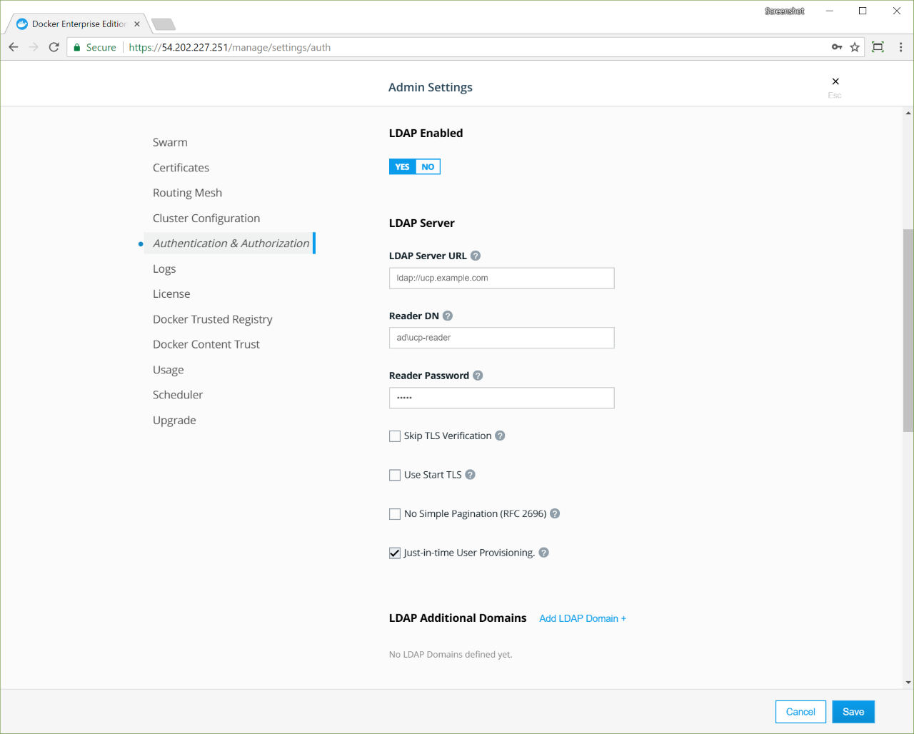 | Just-In-Time User Provisioning | Whether to create user accounts only when users log in for the first time. The default value of true is recommended. If you upgraded from UCP 2.0.x, the default is false. |