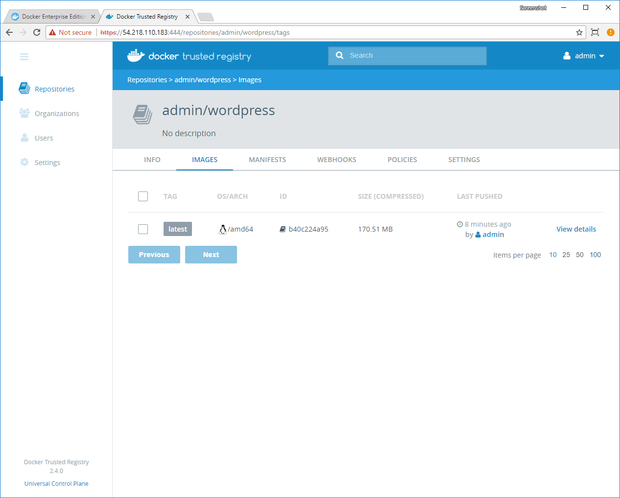 In the DTR web UI, confirm that the wordpress:latest image is store in your