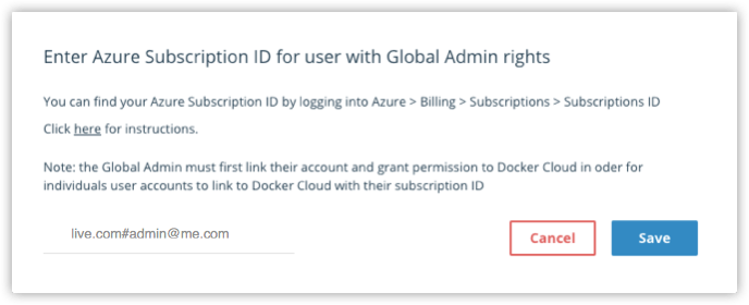 For members of Azure Organizations, your gobal administrator first needs to link their account and grant permissions to Docker Cloud for the organization as a whole. Then, you can link your individual user account to Docker Cloud with your subscription ID.