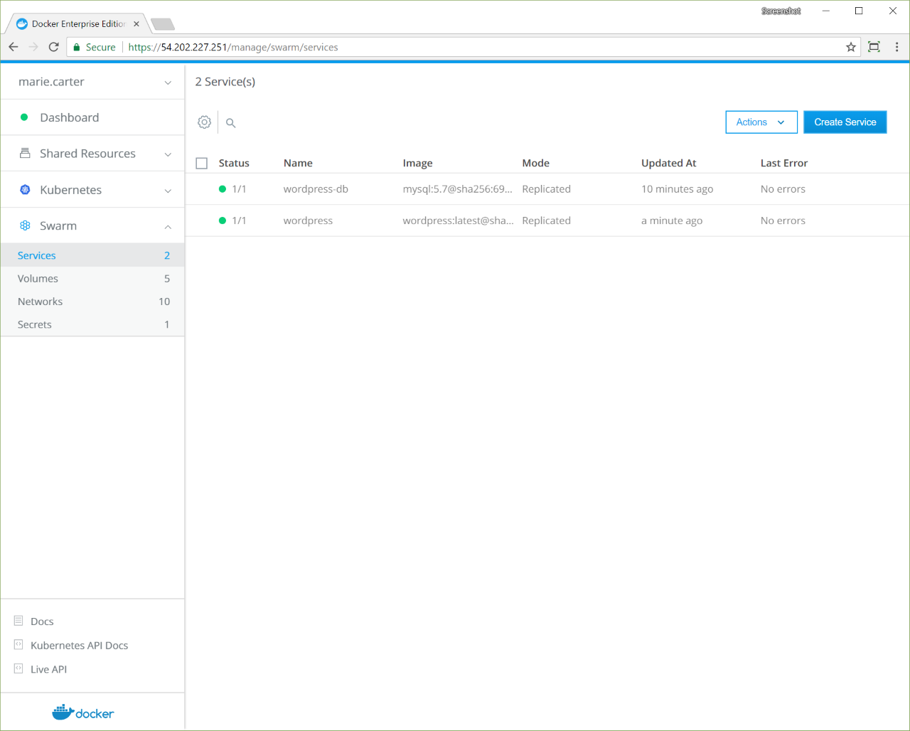 - Navigate to the Services page and click Create Service. Name the service "wordpress", and for the Task Template, use the "wordpress:latest" image.