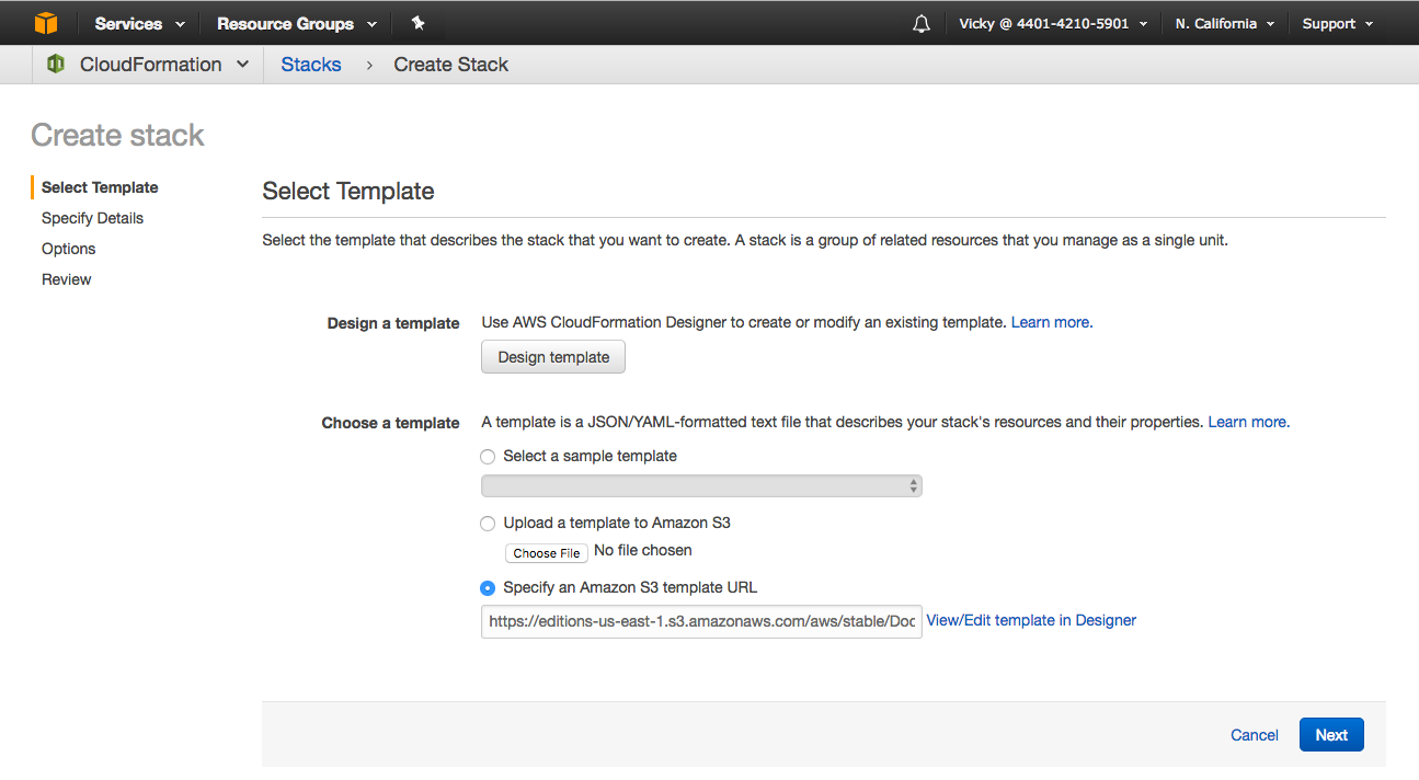 4. When you launch the docker for AWS CloudFormation stack, make sure you use the one for existing VPCs. This template prompts you for the VPC and subnets that you want to use for Docker for AWS.