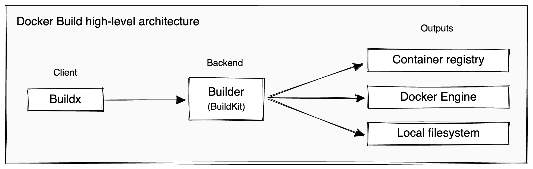 The following diagram shows an example build sequence involving Buildx and BuildKit.