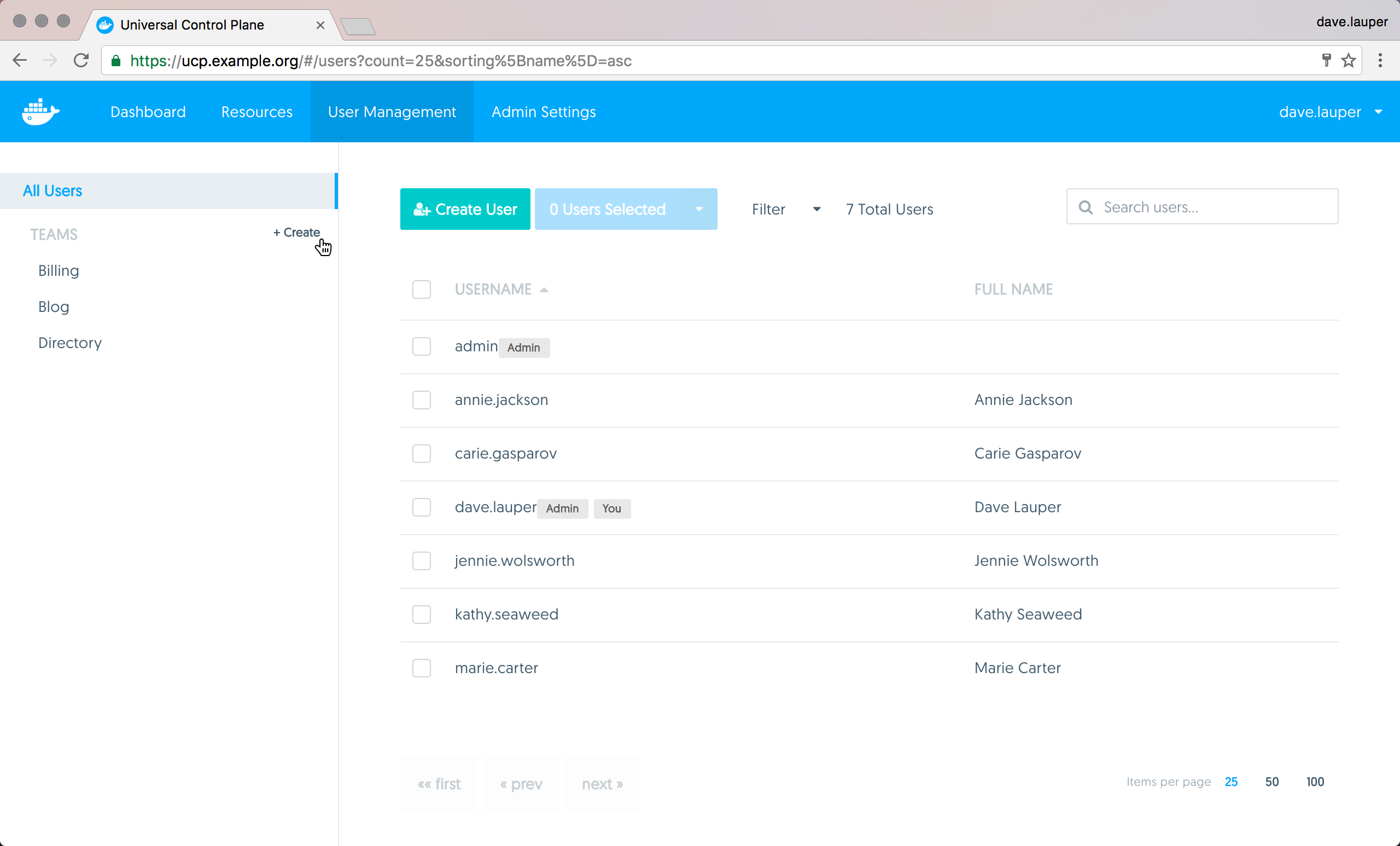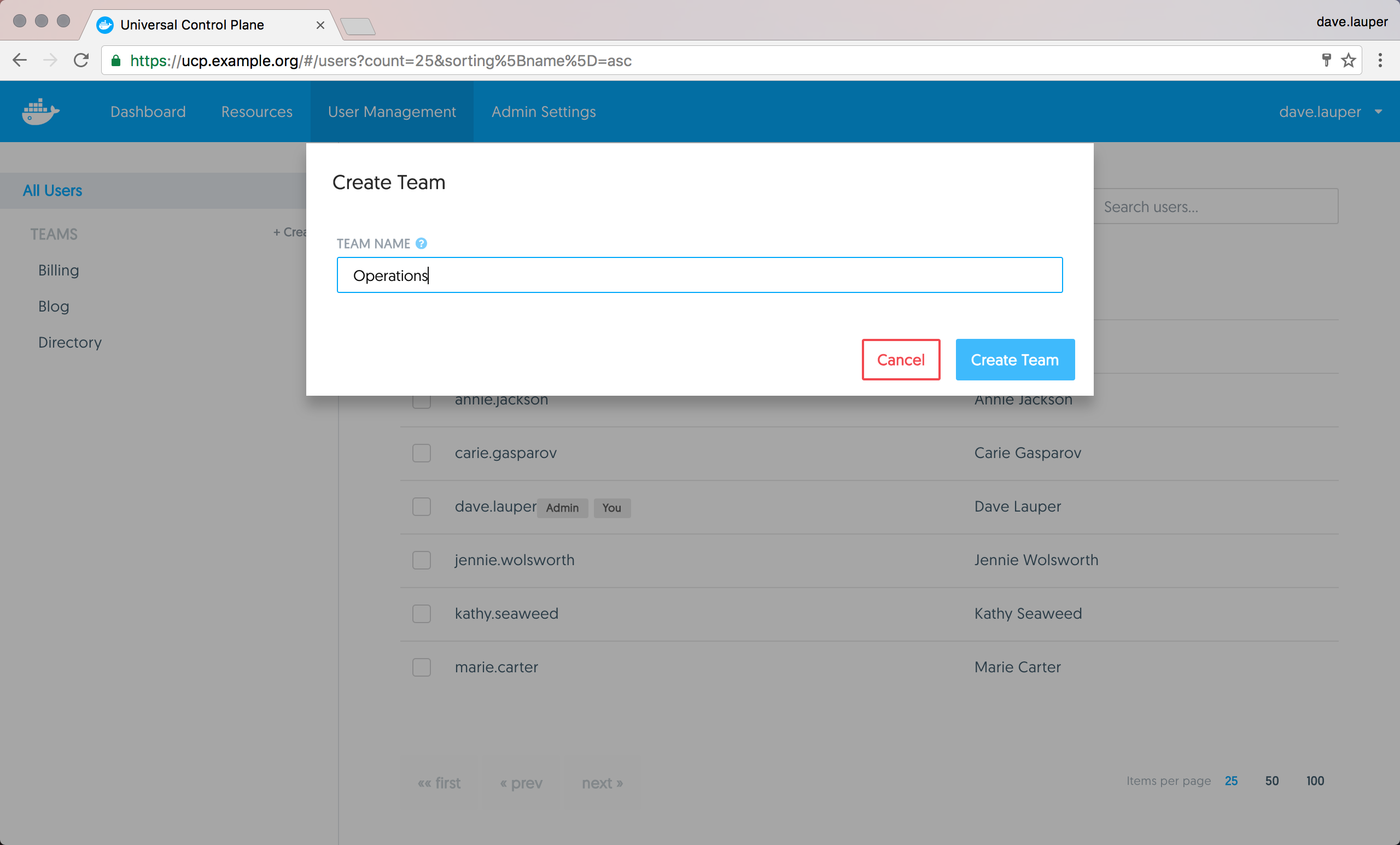 To create a new team, go to the UCP web UI, and navigate to the Users & Teams page.