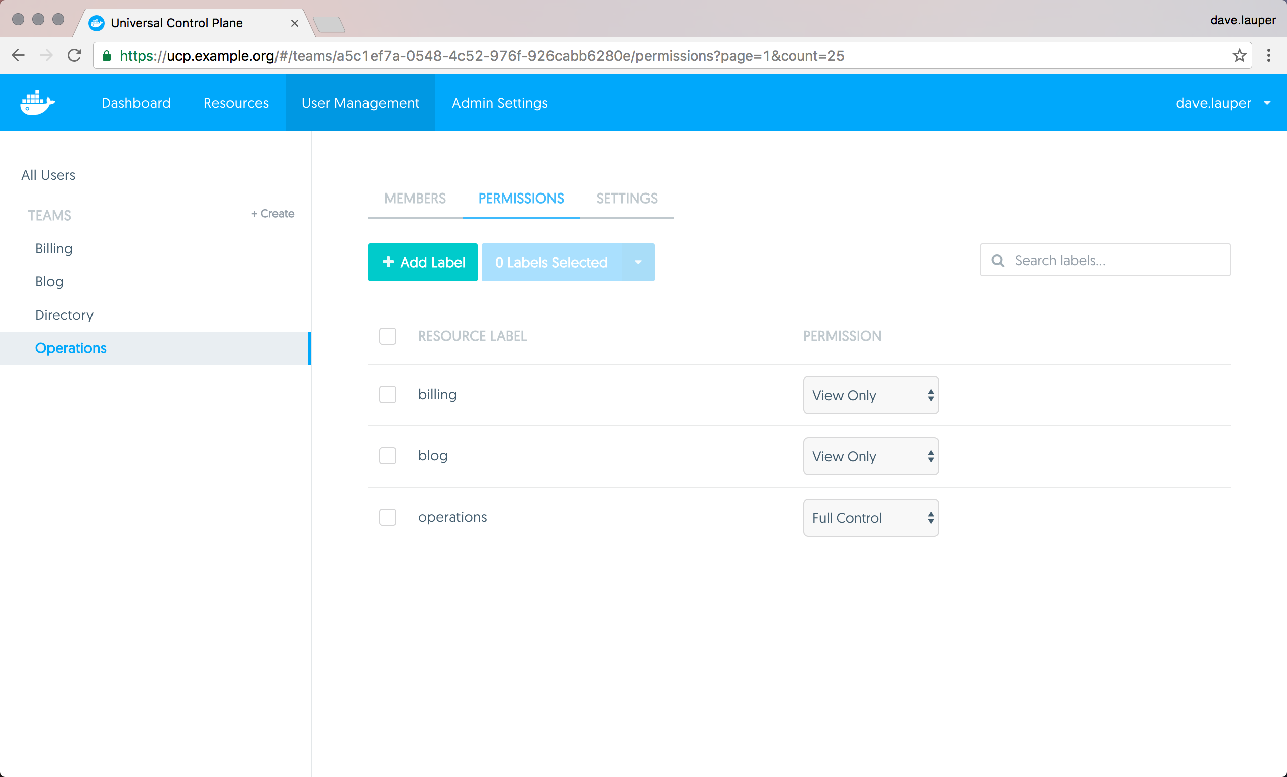 In the example above, members of the 'Operations' team have permissions to create and edit resources that have the labels com.docker.ucp.access.label=operations applied, but can only view resources that have the com.docker.ucp.access.label=blog label.