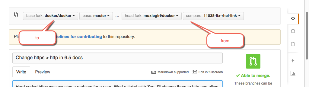 | Basic workflow for Docker contributions | contribute, pull request, review, workflow, beginner, squash, commit | Create a pull request (PR) |