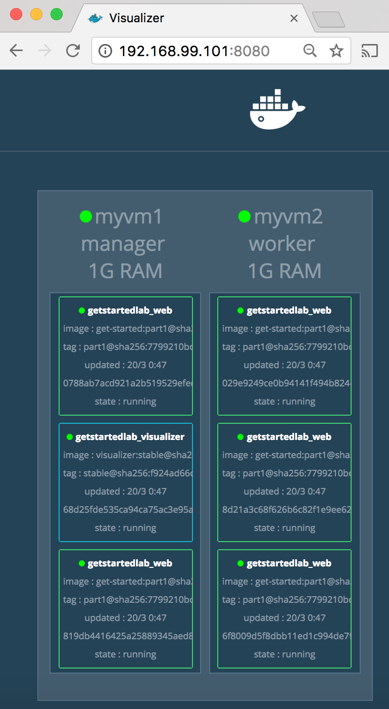 $ docker-machine ssh myvm1 "docker stack deploy -c docker-compose.yml getstartedlab"