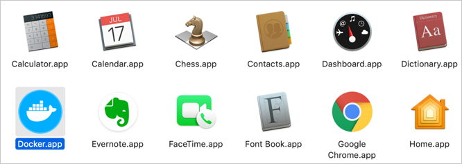 Docker.appin the Applications folder to start Docker. (In the example below, the Applications folder is in "grid" view mode.)You are prompted to authorize