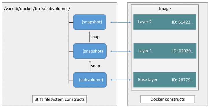 Docker leverages Btrfs subvolumes and snapshots for managing the on-disk components of image and container layers. Btrfs subvolumes look and feel like a normal Unix filesystem. As such, they can have their own internal directory structure that hooks into the wider Unix filesystem.