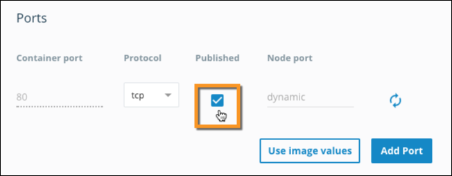 For this tutorial leave the Node port set to dynamic. This means that port 80 of the container is mapped to a random available port in the node in which the container is deployed. To force a specific port in the node, click dynamic and specify a port.
