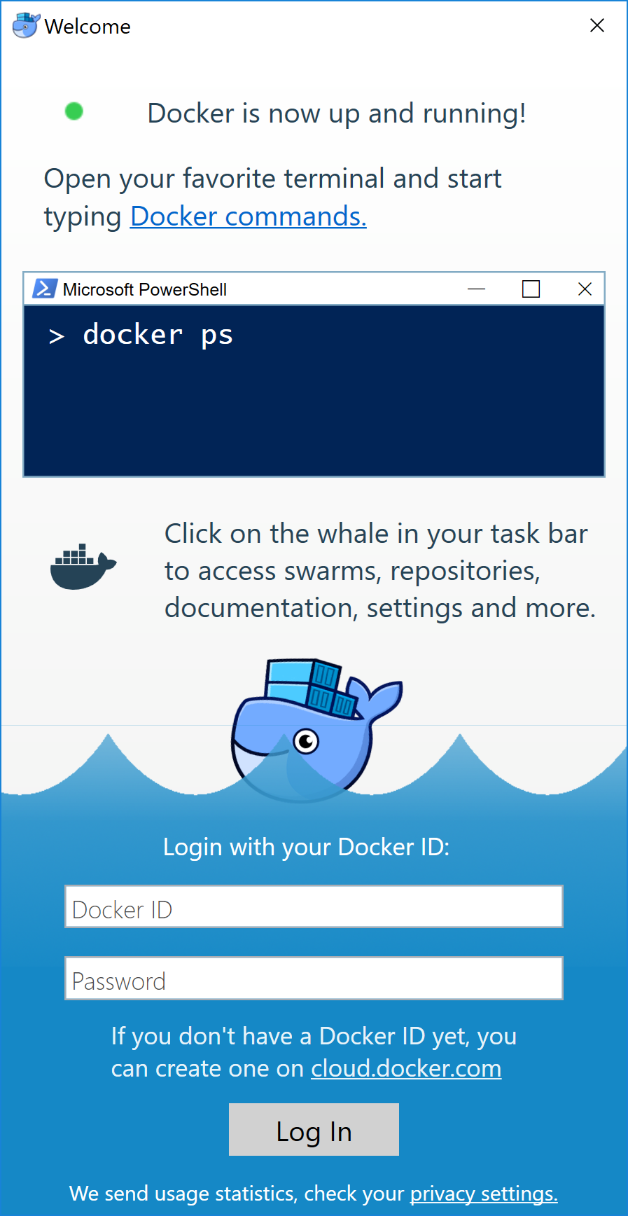 If the whale is hidden in the Notifications area, click the up arrow on the taskbar to show it. To learn more, see Docker Settings.