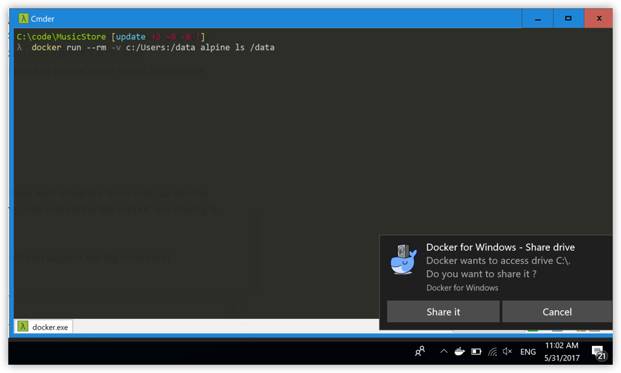 You can select to Share it, in which case it is added your Docker for Windows Shared Drives list and available to containers. Alternatively, you can opt not to share it by hitting Cancel.