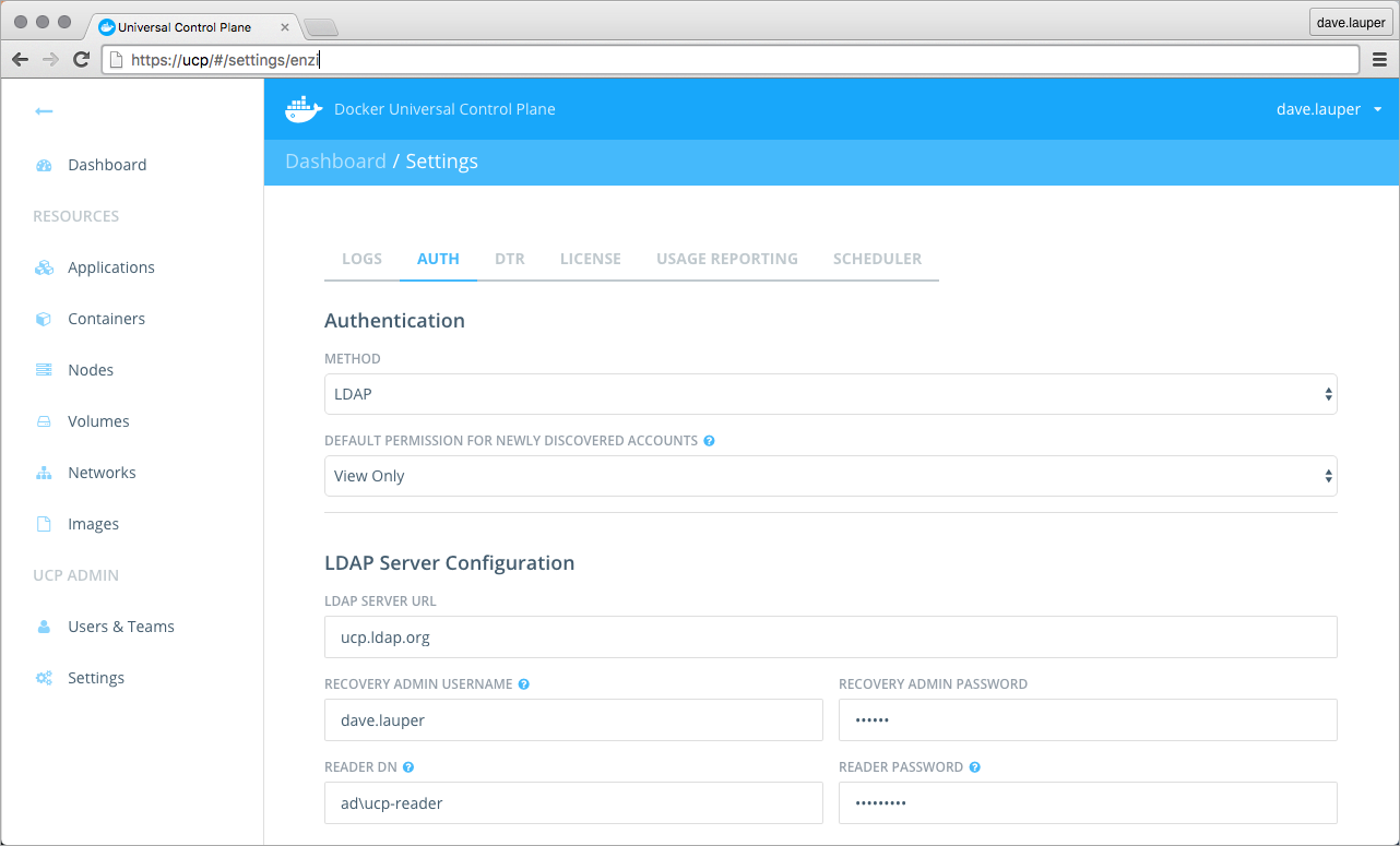 To configure UCP to authenticate users using an LDAP service, go to the UCP web UI, navigate to the Settings page, and click the Auth tab.