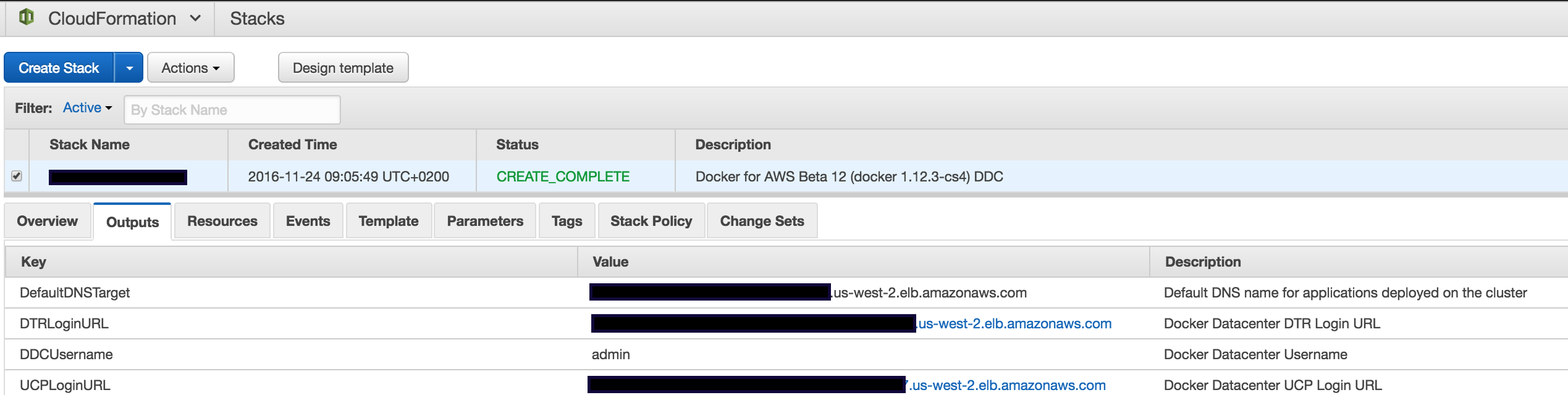 Once the stack is successfully created, you can access UCP and DTR URLs in the output tab as follows: