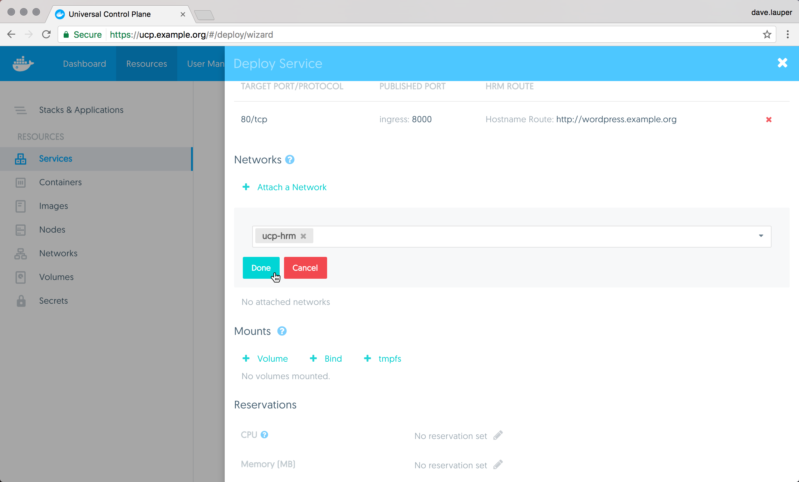 com.docker.ucp.mesh.httplabel. You can use the defaultucp-hrmnetwork or create your own - Publishes the ports that you want to route to