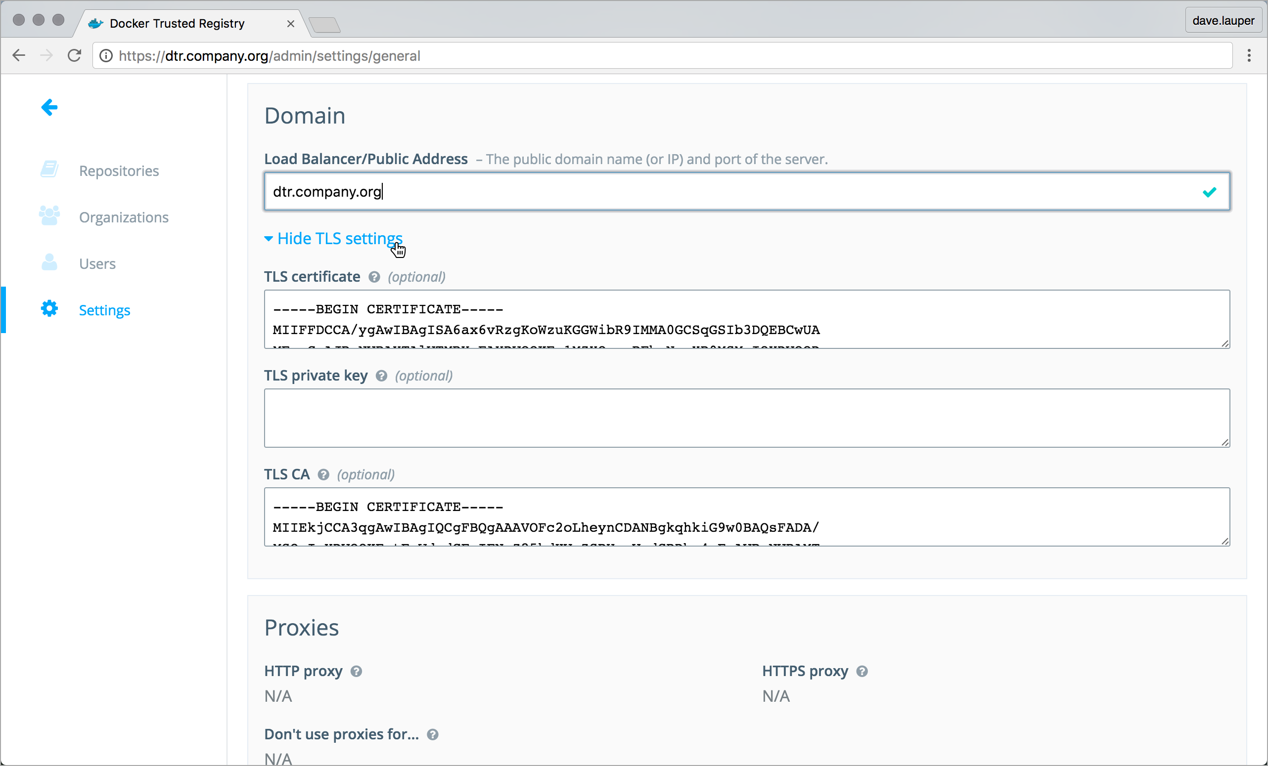 To configure DTR to use your own certificates and keys, go to the DTR web UI, navigate to the Settings page, and scroll down to the Domain section.