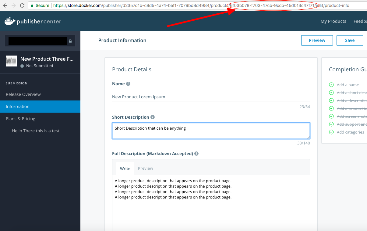 Capture the product ID (from the URL in Docker Store) that you want to reference for the certification test.