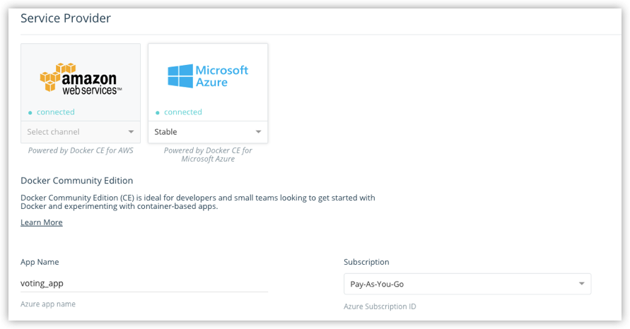 StableorEdge) from the drop-down menu, provide an App name, and select the Azure Subscription you want to use.You can learn more about stable and edge channels in the Install Docker overview and the Docker CE Edge topics.