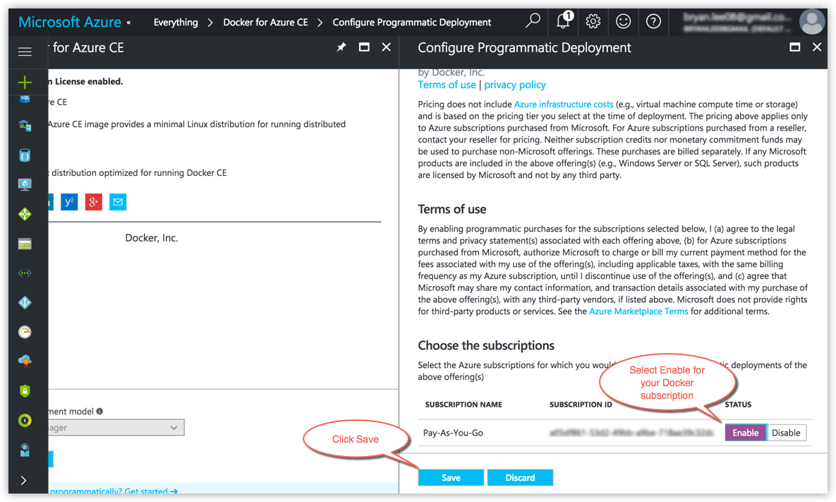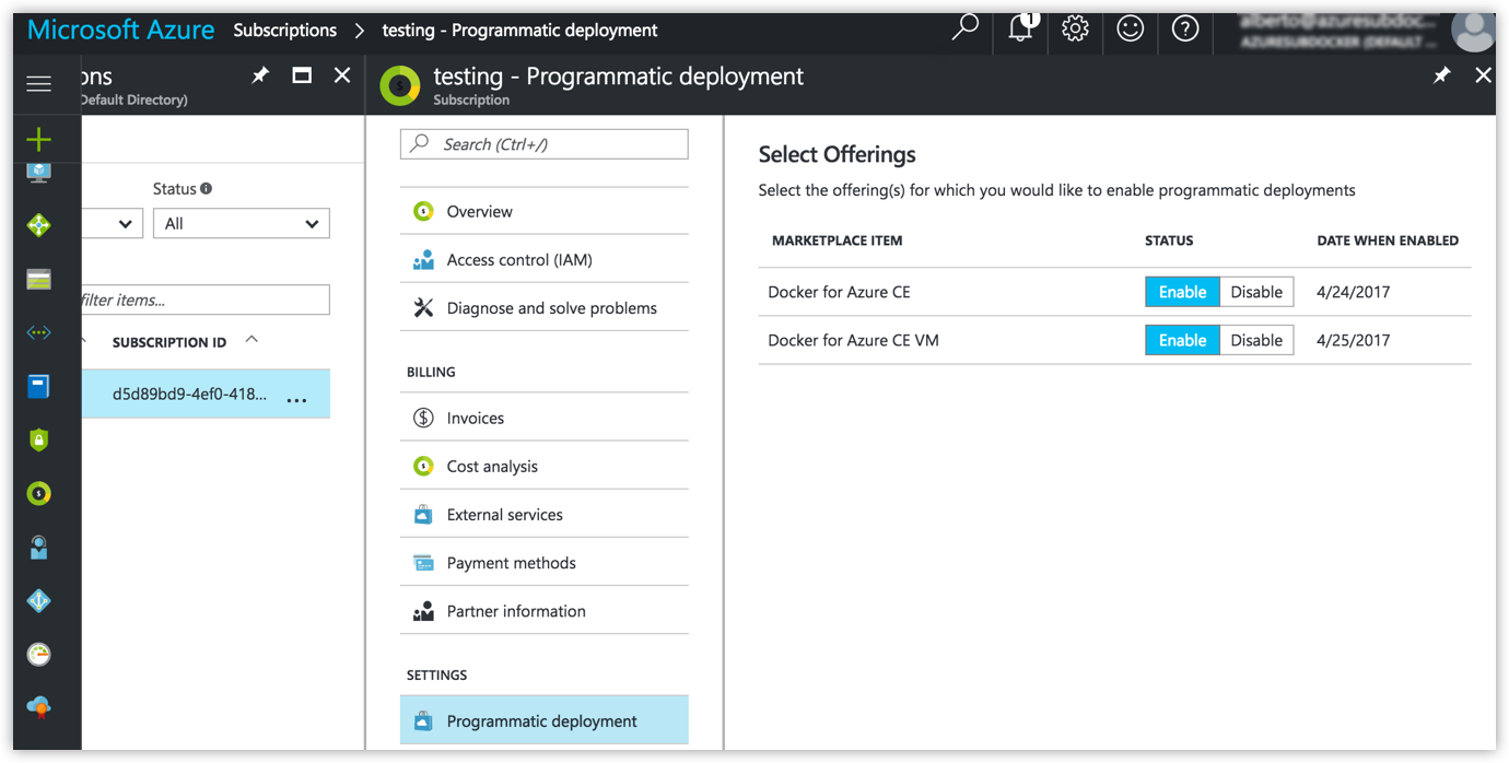 Go to Dashboard -> Subscriptions to view details on your current subscriptions. Docker for Azure CE should be listed as enabled Programmatic deployment.