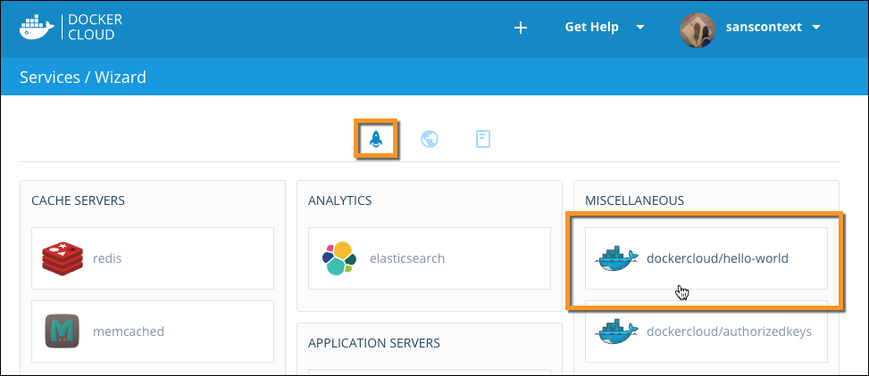 - Choose a Container Image Images can come from Docker Cloud's Jumpstarts library, your personal Docker Hub account or Docker Hub's public index, or from third party registries you connect.