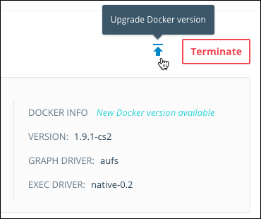 Before you upgrade your nodes, go to the detail page of the node that you want to upgrade. On the left side you will see a Docker Info section that lists the currently installed version of Docker Engine.