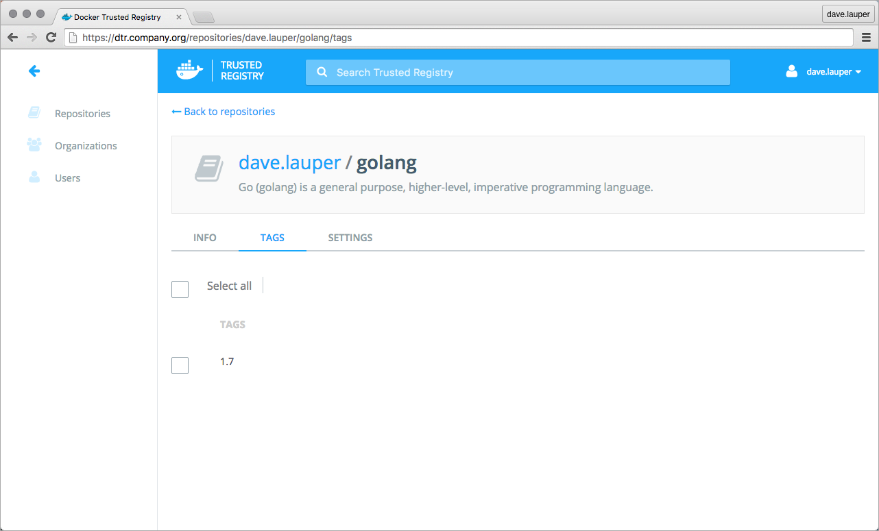 $ docker tag golang:1.7 dtr.company.org/dave.lauper/golang:1.7