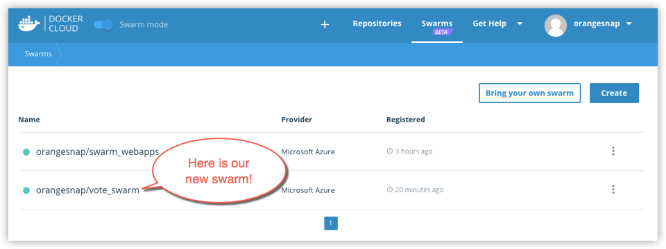 Your Docker ID is pre-populated. In the example, our swarm name is "vote_swarm".