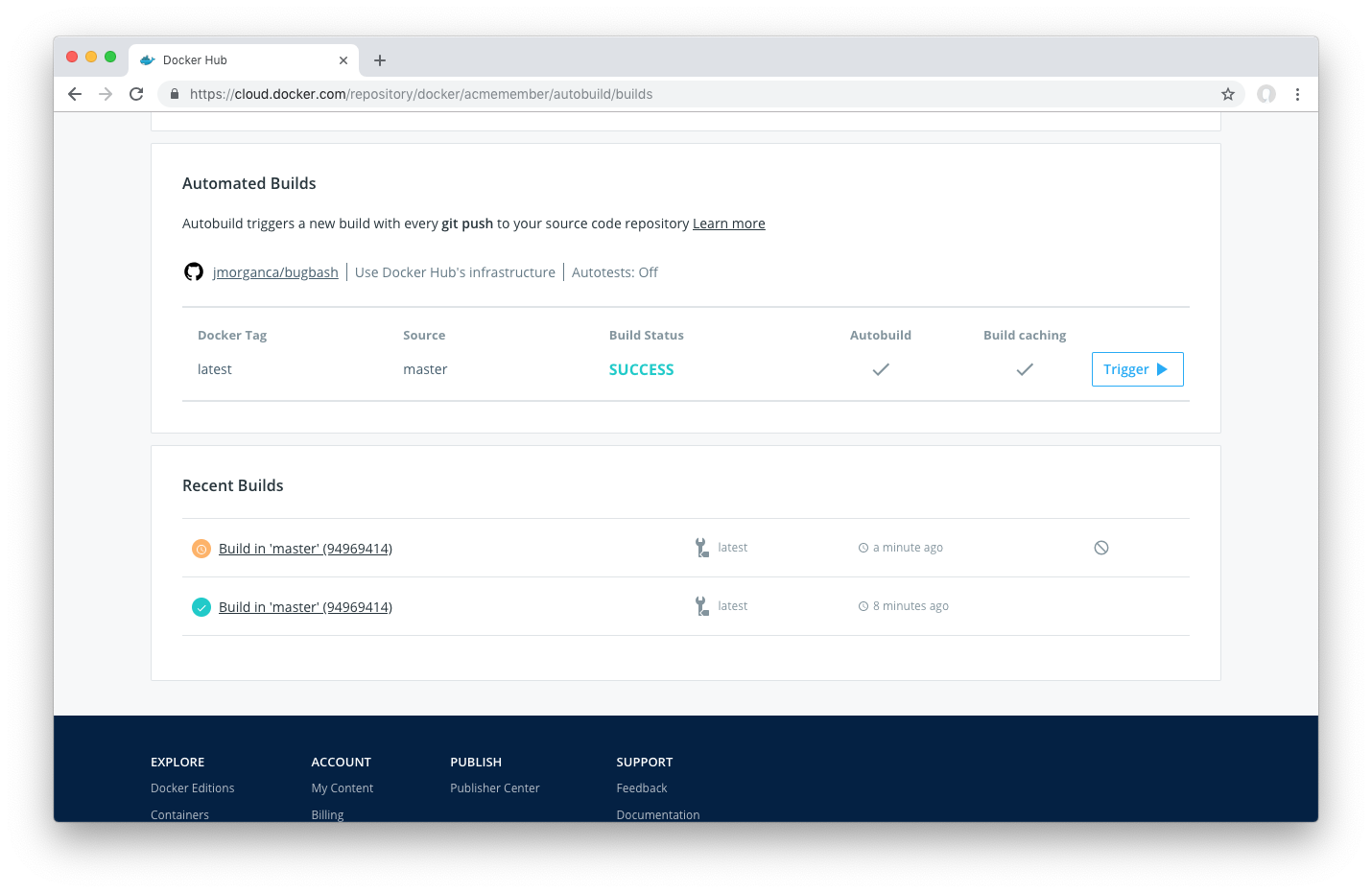 When you set up automated builds (also called autobuilds), you create a list of branches and tags that you want to build into Docker images. When you push code to a source code branch (for example in GitHub) for one of those listed image tags, the push uses a webhook to trigger a new build, which produces a Docker image. The built image is then pushed to the Docker Hub registry.