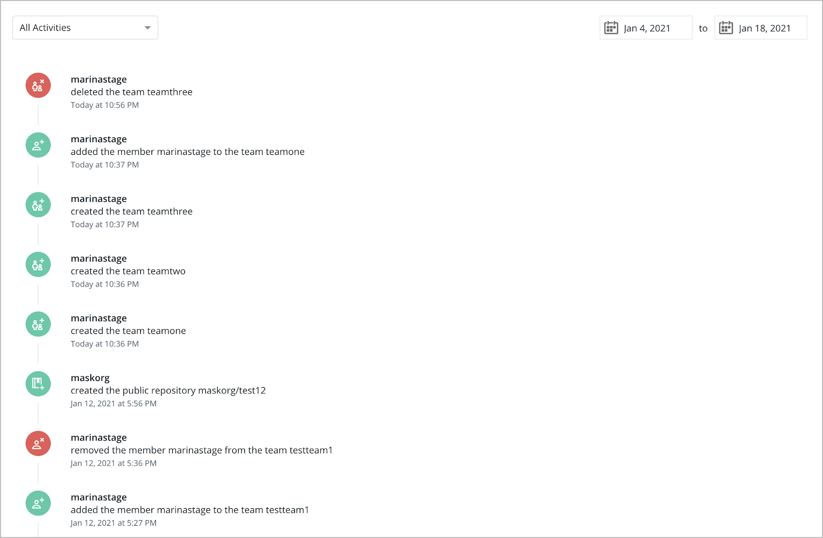 By default, all activities that occur at organization and repository levels are displayed on the Activity tab. Use the calendar option to select a date range and customize your results. After you have selected a date range, the Activity tab displays the Audit log of all the activities that occurred during that period.