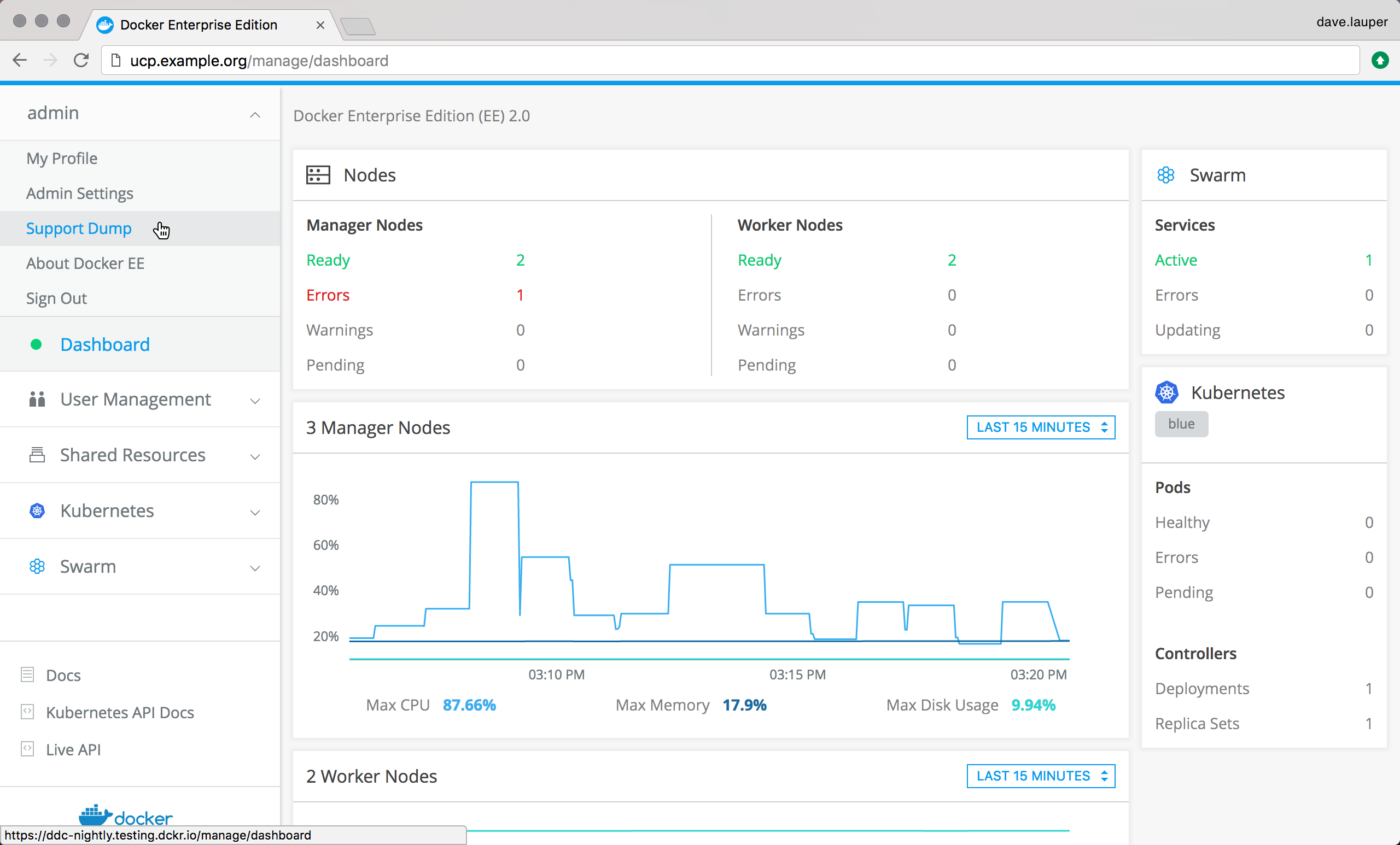 Docker Support engineers may ask you to provide a UCP support dump, which is an archive that contains UCP system logs and diagnostic information. If a node is not joined to the cluster and healthy, the support dump from the web UI will not contain logs from the unhealthy node. For unhealthy nodes use the CLI to get a support dump.