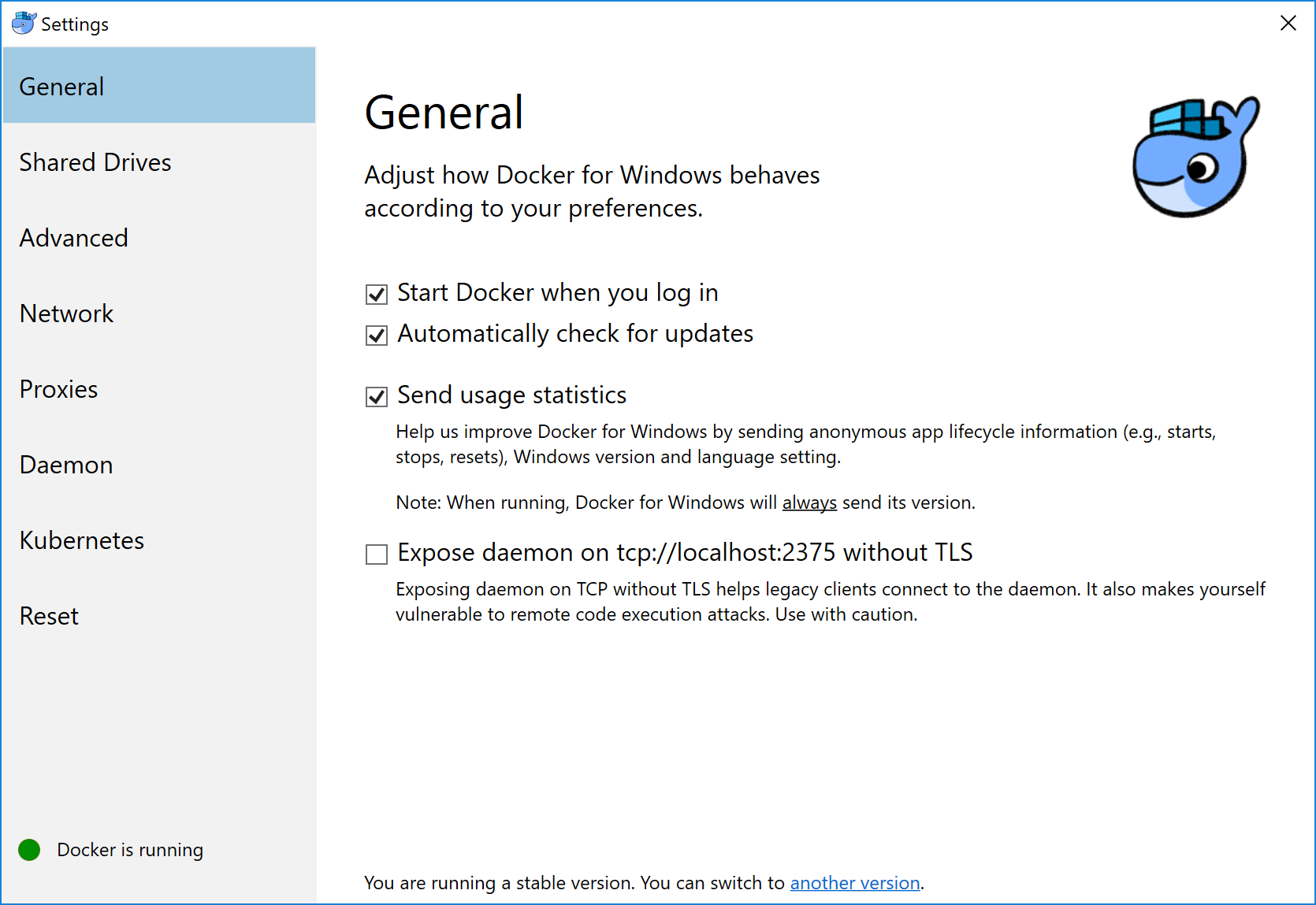 Send usage statistics - By default, Docker for Windows sends diagnostics, crash reports, and usage data. This information helps Docker improve and troubleshoot the application. Uncheck to opt out. Docker may also sometimes prompt you for more information.