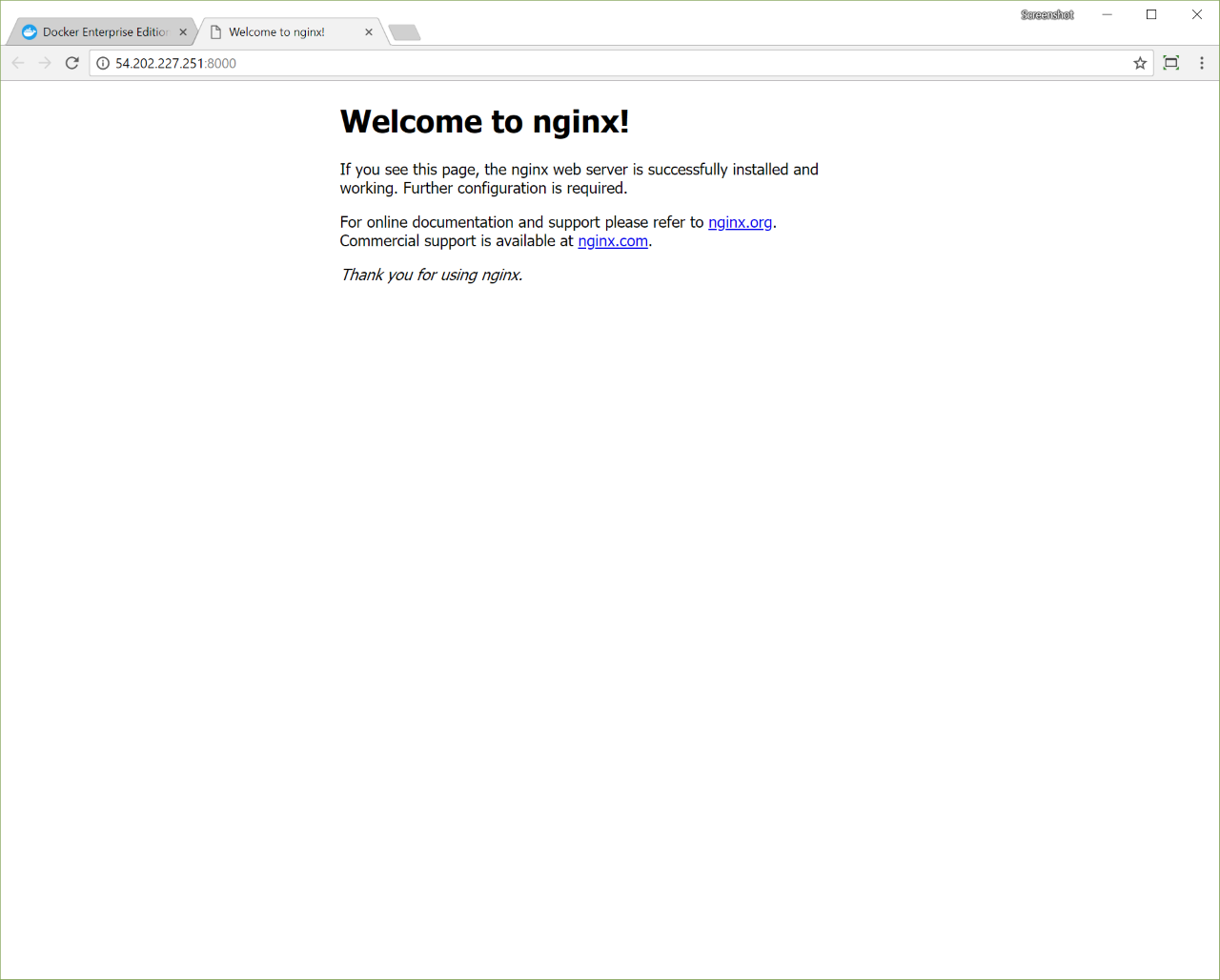 Clicking the link opens a new tab that shows the default NGINX home page.