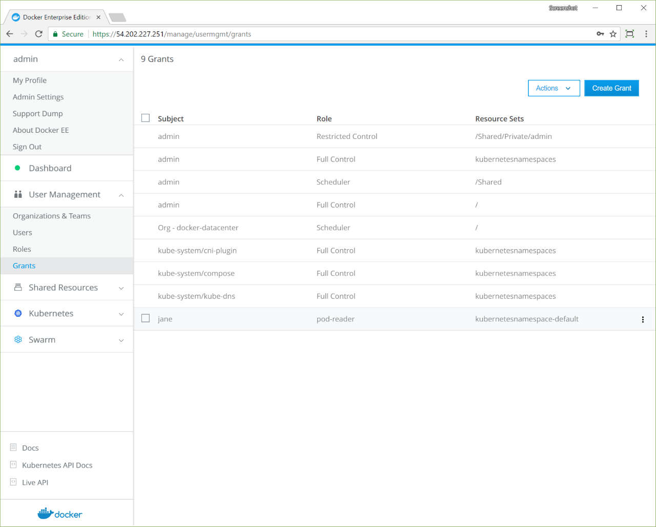 With Docker Enterprise Edition, you can create roles and grants that implement the permissions that are defined in your Kubernetes apps. Learn about RBAC authorization in Kubernetes.