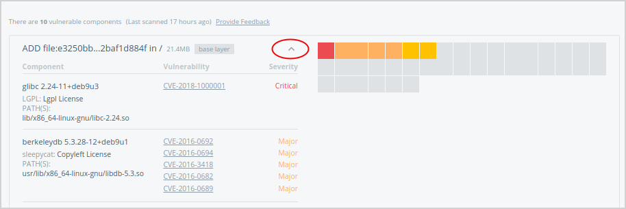 Click the arrow icon (twice) to expand the list and show all vulnerable components and their CVE report codes.