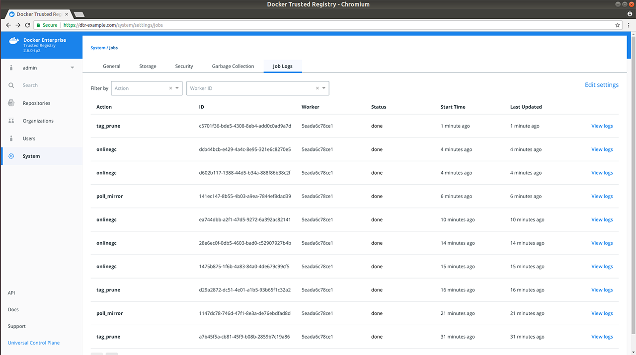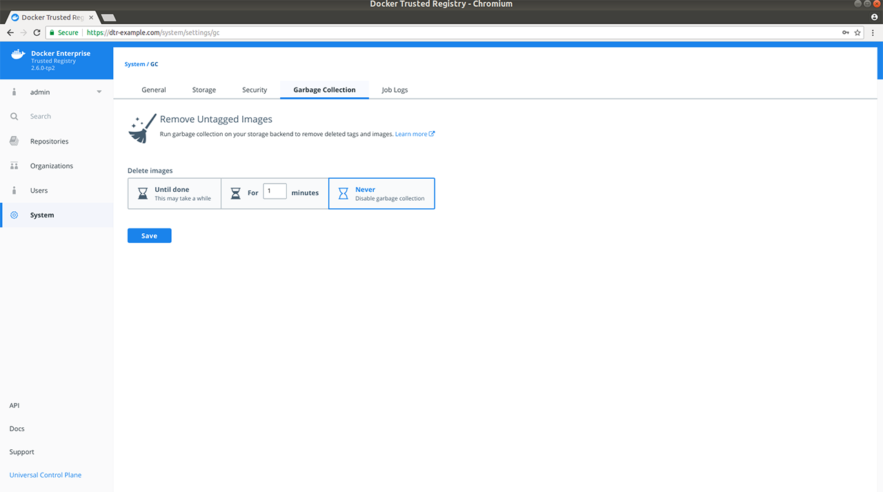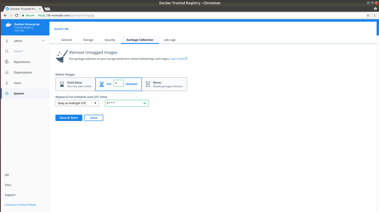 In your browser, navigate to https://<dtr-url> and log in with your credentials. Select System on the left navigation pane, and then click the Garbage collection tab to schedule garbage collection.