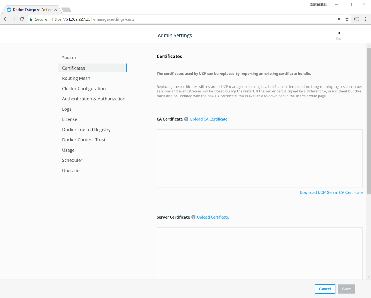 Use your own TLS certificates Learn how to configure Docker Universal Control Plane to use your own certificates. Universal Control Plane, UCP, certificate, authentication, tls