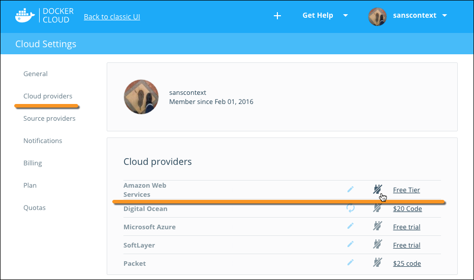 In the Cloud Providers section, click the plug icon next to Amazon Web Services.