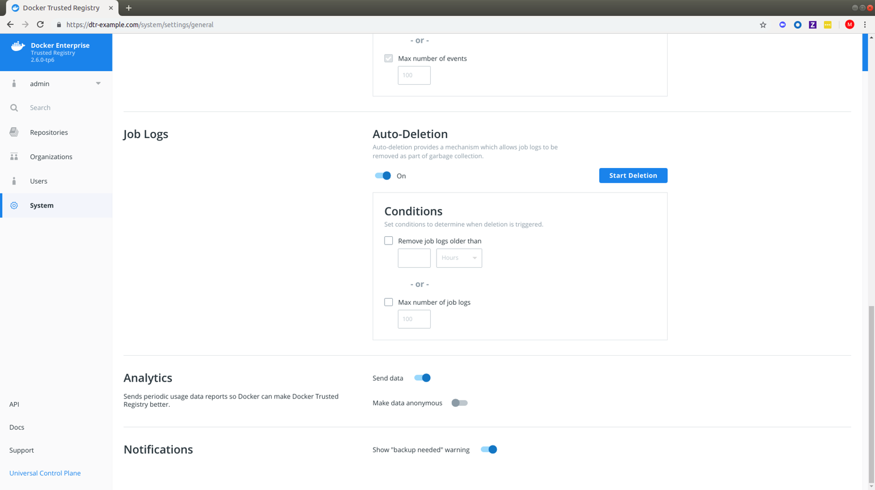 Docker Trusted Registry has a global setting for auto-deletion of job logs which allows them to be removed as part of garbage collection. DTR admins can enable auto-deletion of repository events in DTR 2.6 based on specified conditions which are covered below.