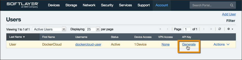 Although any SoftLayer account with the right privileges works, we recommend creating a new dockercloud-user user. If you have already created a service user, or do not wish to do so, continue to Add SoftLayer Account Credentials.