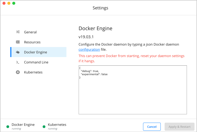 Click Apply & Restart to save the settings. This instantiates images required to run the Kubernetes server as containers, and installs the /usr/local/bin/kubectl command on your Mac.
