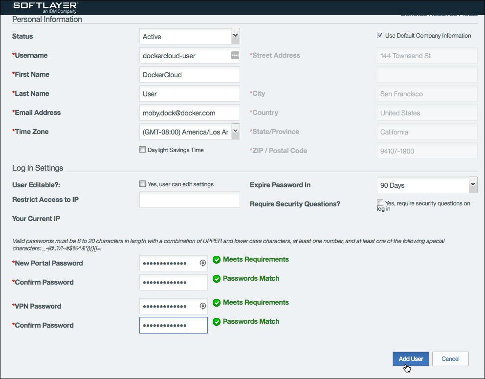 Although any SoftLayer account with the right privileges will work, we recommend creating a new dockercloud-user user. If you have already created a service user, or do not wish to do so, continue to Add SoftLayer Account Credentials.