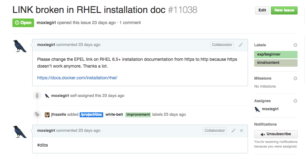 Your issue # will be different depending on what you claimed. After a moment, Gordon the Docker bot, changes the issue status to claimed. The following example shows issue #11038.