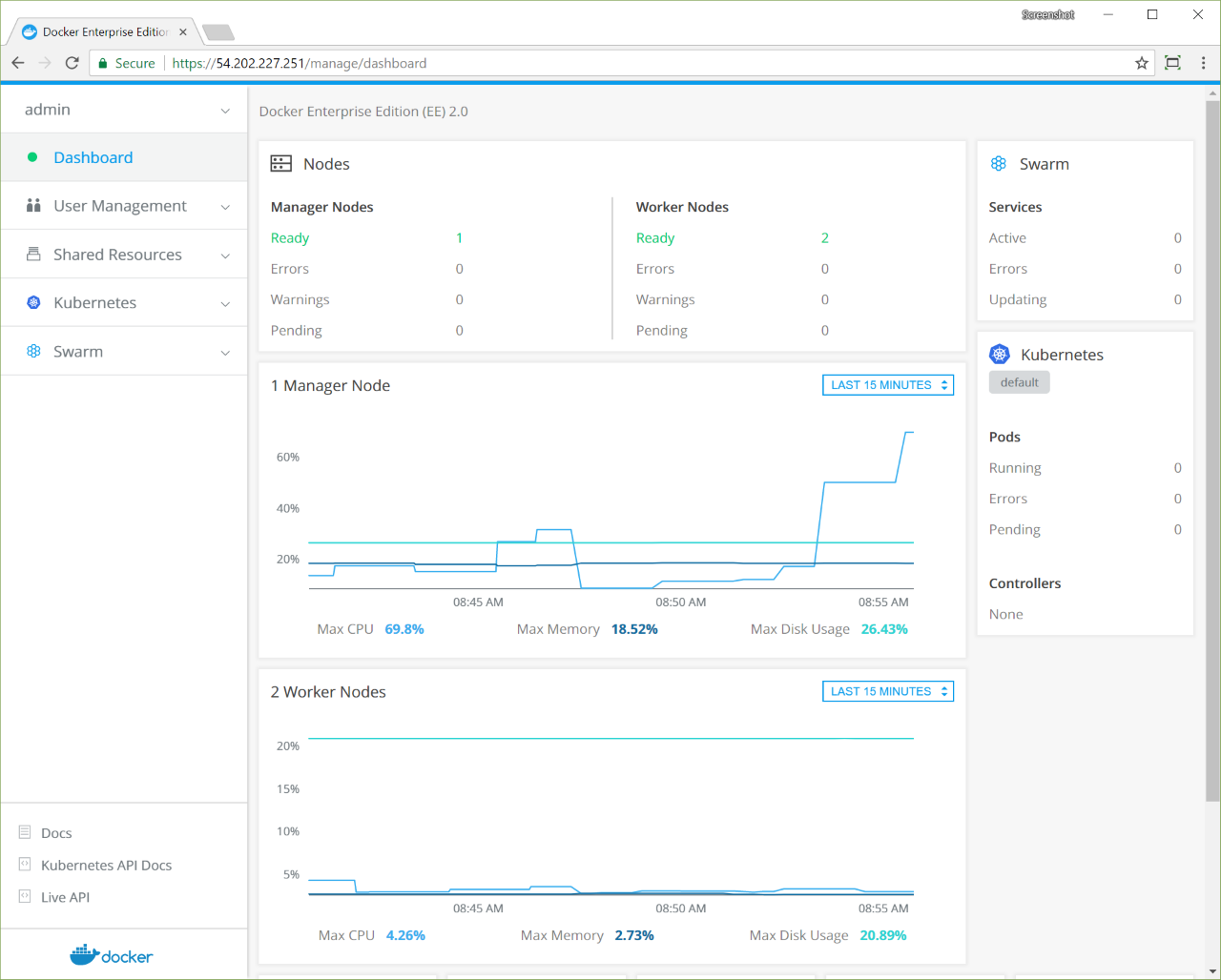 With Docker EE, you can manage from a centralized place all of the computing resources you have available, like nodes, volumes, and networks.