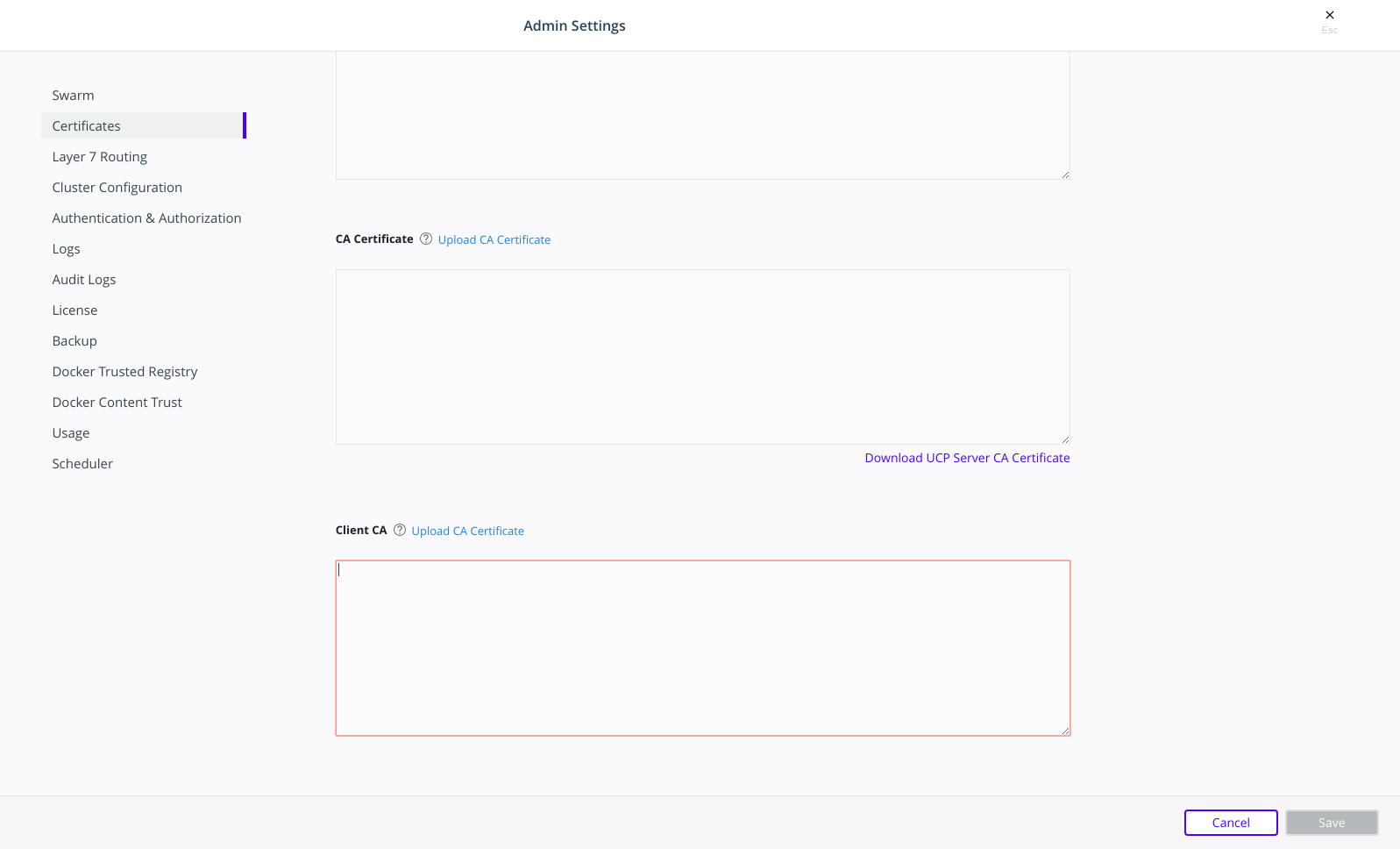 As of UCP v3.2, the Certificates page includes a new text field, Client CA, that allows you to paste or upload one or more custom root CA certificates which the UCP Controller will use to verify the authenticity of client certificates issued by your corporate or trusted third-party CAs. Note that your custom root certificates will be appended to UCP's internal root CA certificates.