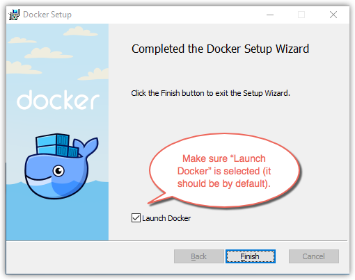 Click Finish on the setup complete dialog to launch Docker.