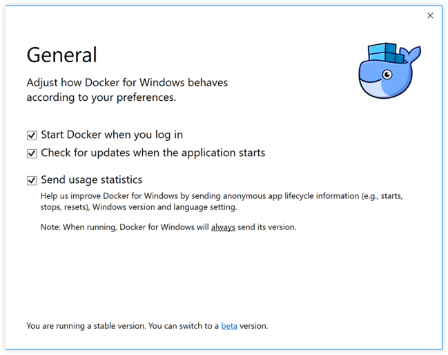 | This installer is fully baked and tested, and comes with the latest GA version of Docker Engine. This is the best channel to use if you want a reliable platform to work with. These releases follow a version schedule with a longer lead time than the betas, synched with Docker Engine releases and hotfixes. On the stable channel, you can select whether to send usage statistics and other data. |
