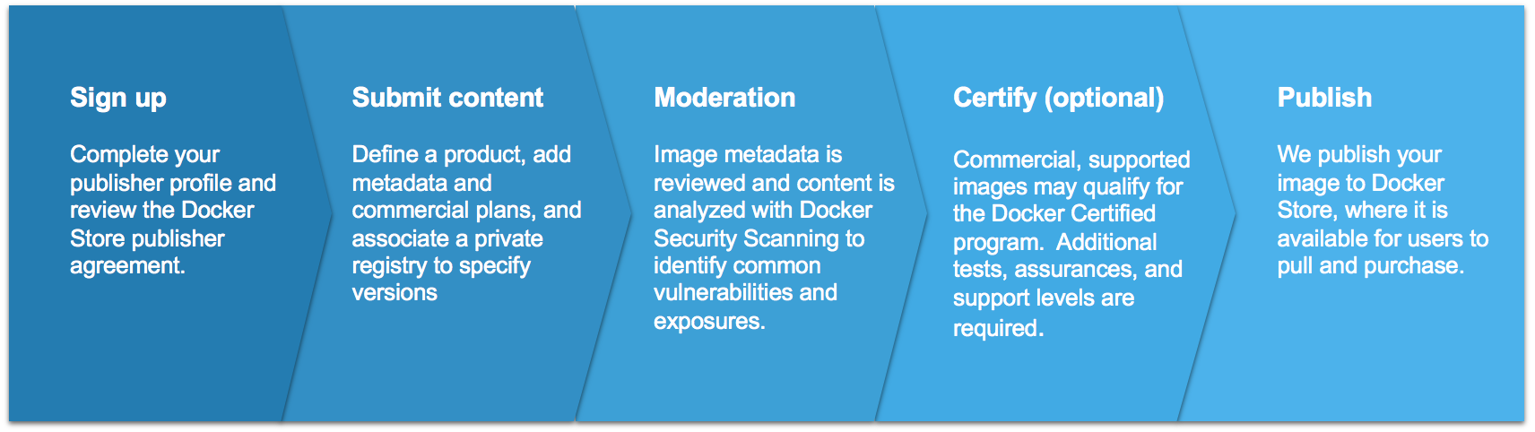 Commercial content and other supported images may qualify for the Docker Certified Container or Plugins quality mark. The testing for this program goes beyond the vulnerability scan and also evaluates container images for Docker best practices developed over years of experience. Collaborative support capability between Docker and the publisher is also established. Refer to the diagram below for a high-level summary: