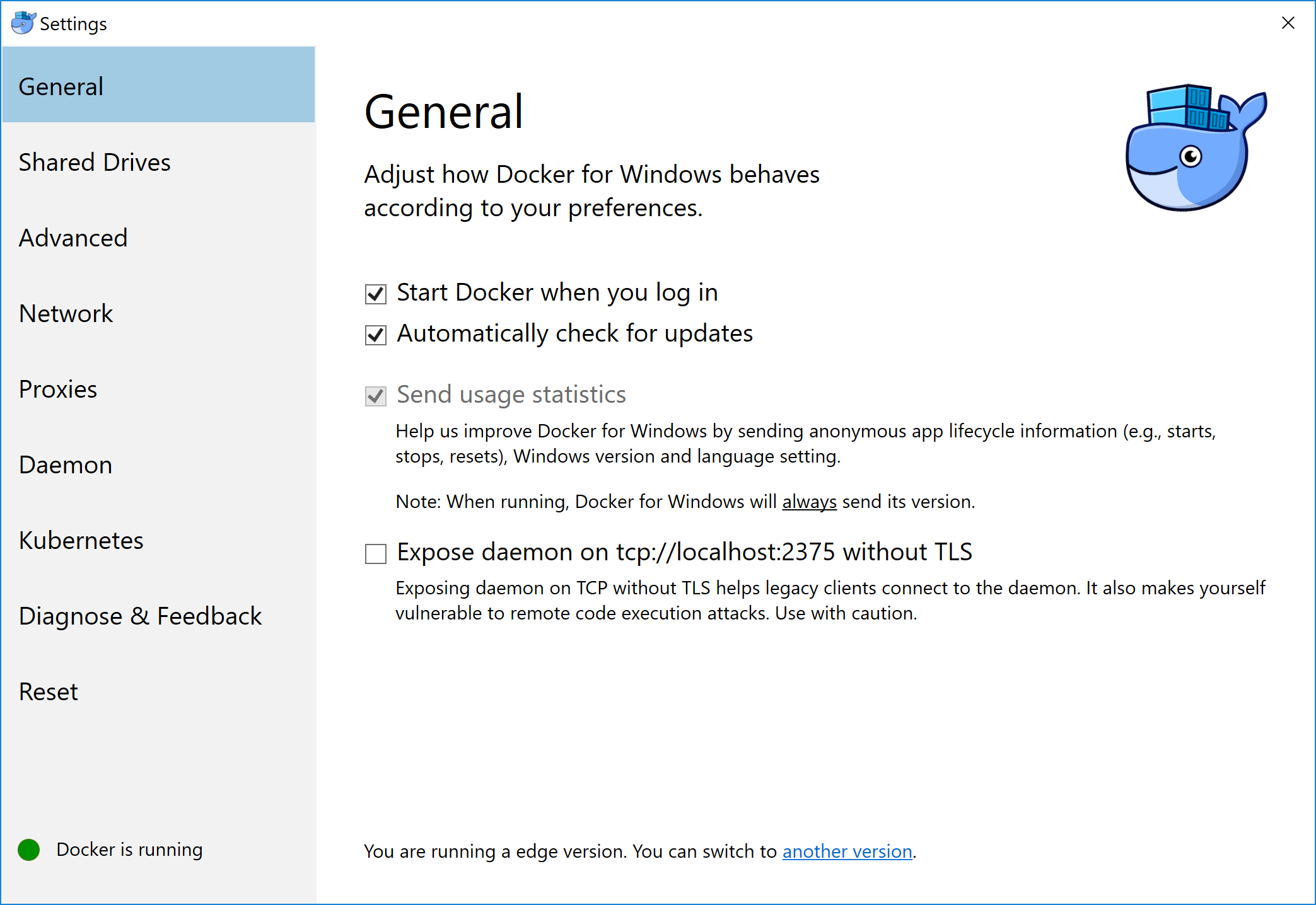 Send usage statistics - By default, Docker for Windows sends diagnostics, crash reports, and usage data. This information helps Docker improve and troubleshoot the application. Uncheck to opt out. Docker may also sometimes prompt you for more information.